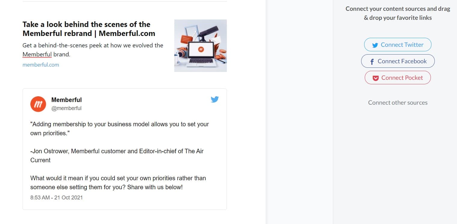 On the ‘Create’ newsletter editing screen, you’ll build and edit your newsletters, where each newsletter is referred to as an ‘issue.’ You can type out your content into paragraphs and headings as well as curate media such as images and videos. Connect social media such as Twitter, Facebook, and bookmarking service Pocket to be able to import content from those channels.
