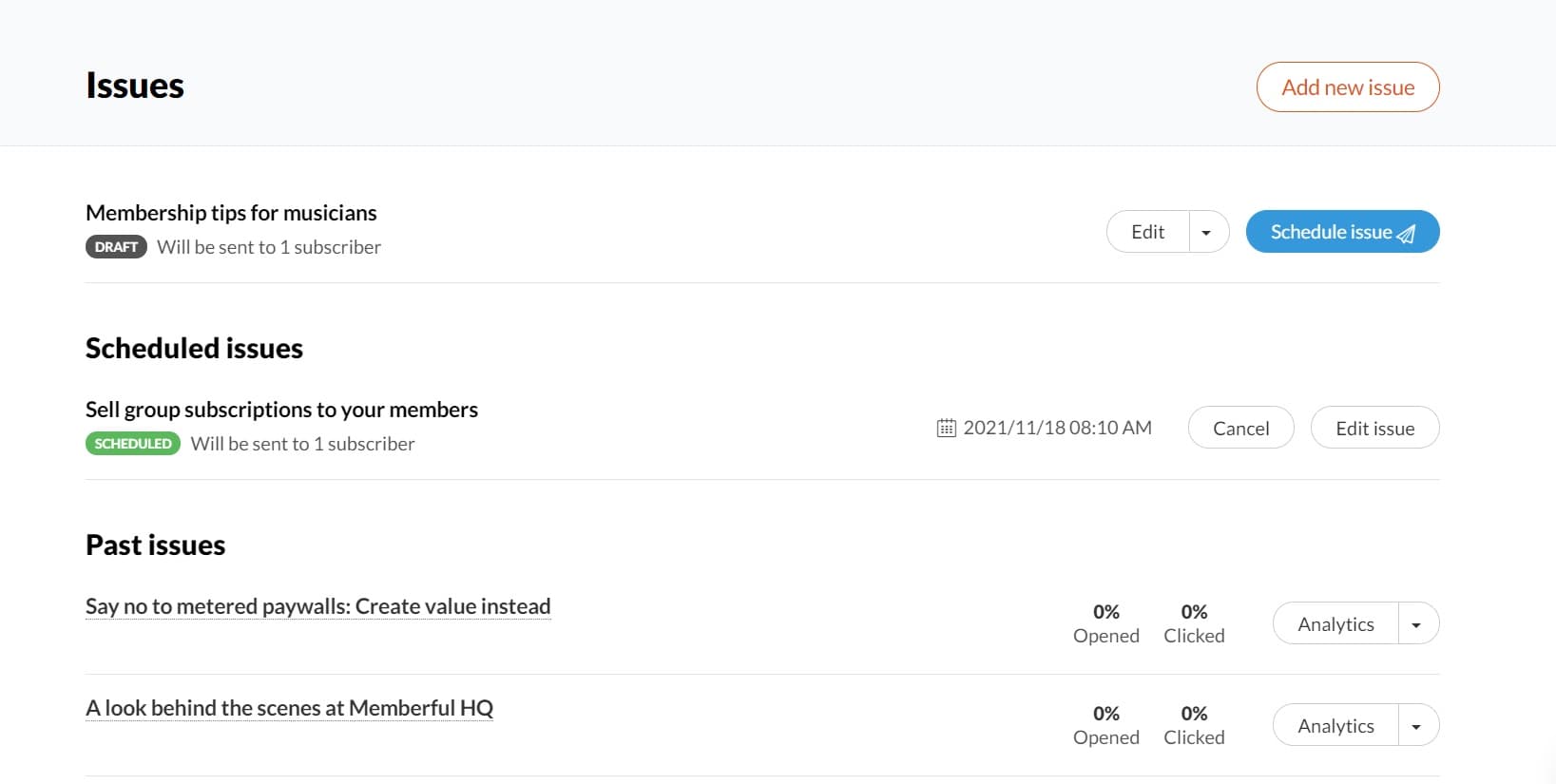 Once you’ve sent/scheduled your newsletter, you’ll automatically progress to the Issues page. Here you can edit the current issue (if it hasn’t been sent yet) as well as duplicate it or delete it. You’ll also see metrics including open rates and click rates for past issues.
