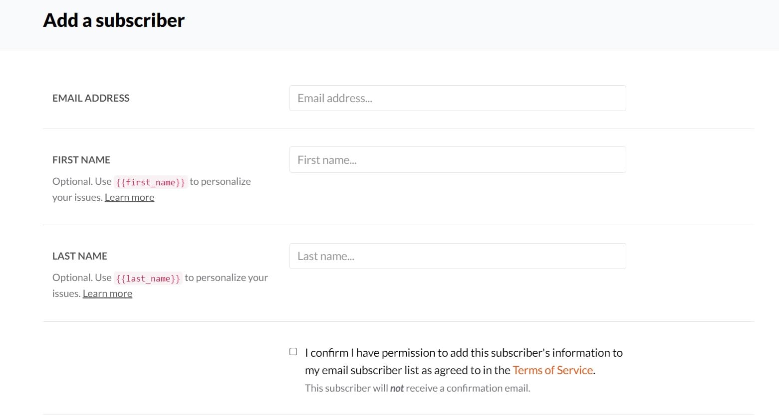 To add more subscribers, you can manually add them by their email address or you can export your existing mailing list from MailChimp, TinyLetter, Patreon, and similar platforms to a CSV file and then upload it. The Substack upload tool will import any email address it finds, so only upload those who have opted in to your list.