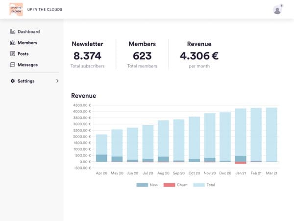 The Dashboard page displays your numbers for revenue, paying/guest/trial members, newsletter subscribers, and unique visitors, all broken down month-by-month.