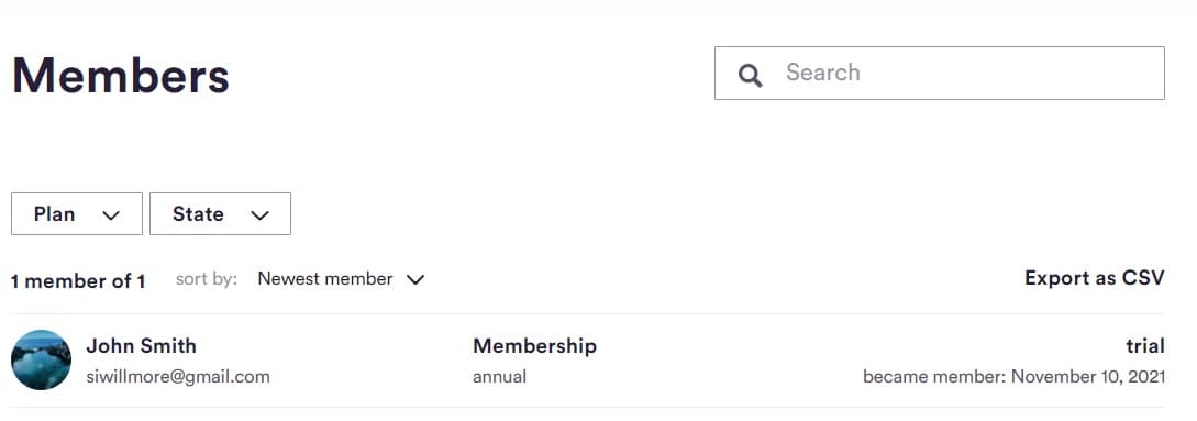 Here you’ll see a searchable list of all your members that you can filter by plan (newsletter or membership) and their membership state (either guest, trial, active, expiring or terminated). You can also export your mailing list as a CSV for use with other platforms.