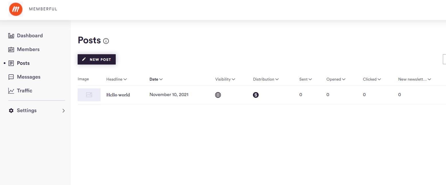 On the Posts page you’ll see some comprehensive statistics for any post already written and/or sent. The information includes each post’s headline, publication date, visibility (public or secret), distribution (newsletter, web page and/or podcast), open/click rates, and any new member sign-ups.