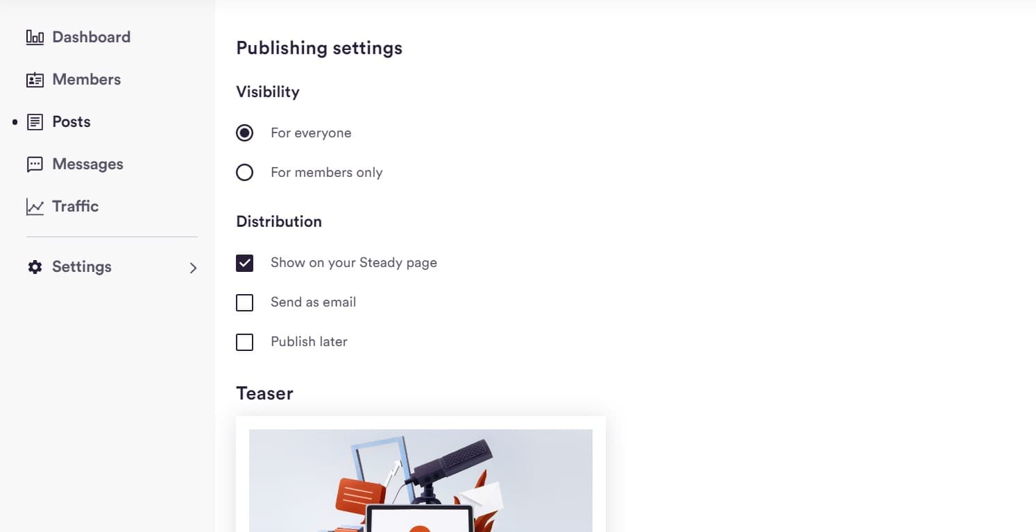 Click Continue to land on the Publishing settings page. Here, you can change the visibility of the post — visible for everyone or just your members — and the distribution — whether to show on your Steady page or send as email. You can also edit teaser content that will show on social media and choose to publish the post now or later.