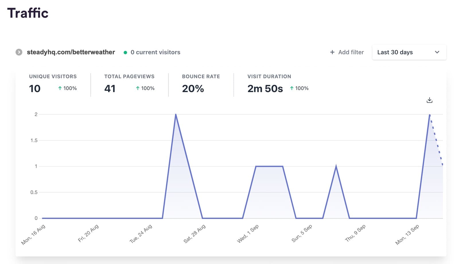At the top of the Traffic page you’ll see your page’s traffic over time. It also shows you the number of unique visitors, the total number of page views, your page’s bounce rate (the percentage of visitors who only visit a single page), and the average visit duration.